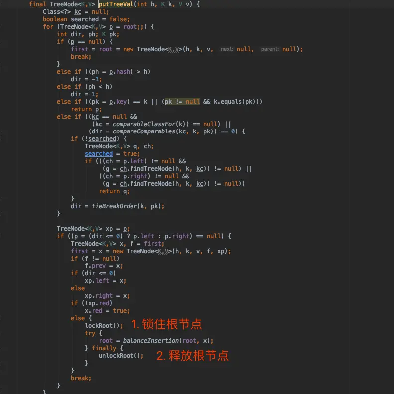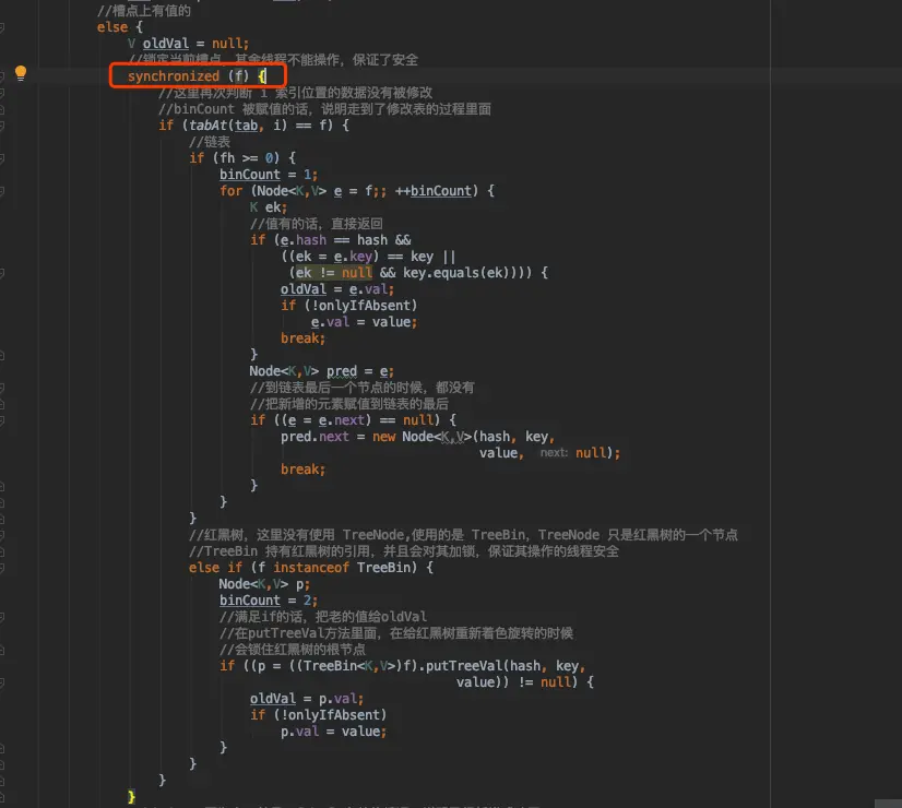 5、对数组的槽点进行操作时,会先锁住槽点,保证只有当前线程才能对槽点上的链表或红黑树进行操作;