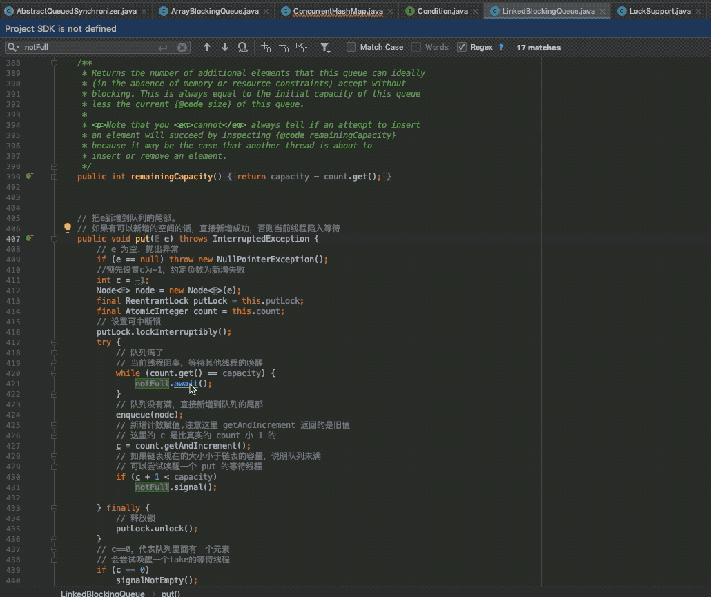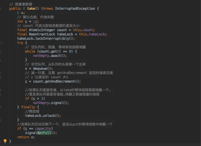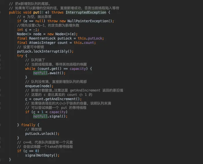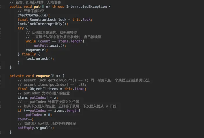 大概意思就是当存入的数据已经达到内部最大容量,那么就会陷入线程阻塞,只有等 take 函数唤醒的时机才会执行后面的代码。如果队列未满,就直接入队列,把当前新增的元素放入尾端。最后在通知消费者也就是 take 函数可以取数据了。