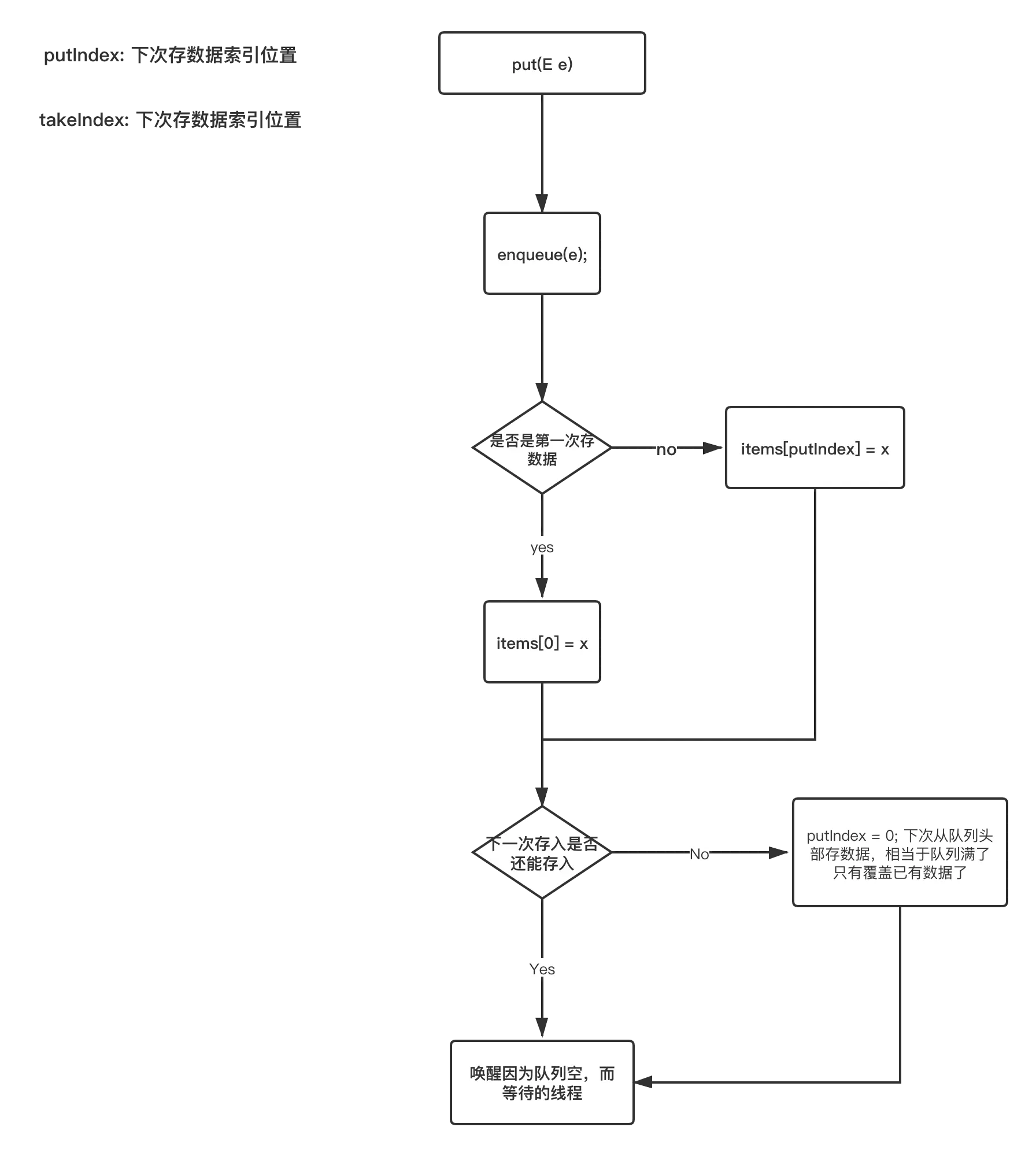 根据流程图,我们知道,先根据 putIndex 来存入数据,然后计算下一次 putIndex 的值跟队列大小比较,如果相等说明下一次就只能从队列头部存入了。