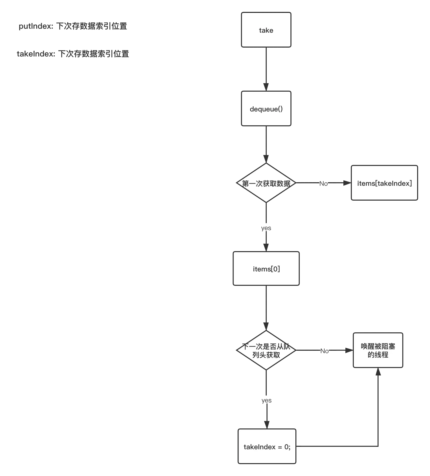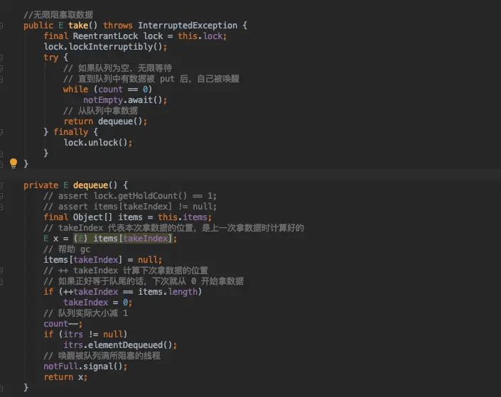 根据流程图,我们知道,先根据 takeIndex 来拿到数据,然后计算下一次 takeIndex 的值跟队列大小比较,如果相等说明下一次就只能从队列头部拿数据了。