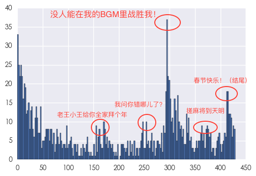 - “老王小王给你全家拜个年”:隔壁老王(在弹幕中的出现概率为0.86%)的威慑力还是很强的,另外估计还要王健林(在弹幕中的出现概率为0.13%)的小目标加上王思聪(在弹幕中的出现概率为0.07%)的国民老公在挑逗观众的情绪