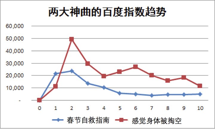下图比较了上海彩虹室内合唱团的两大神曲《感觉身体被掏空》和《春节自救指南》,在发布之后的百度指数走势。两首神曲都是在发布第二天即冲上人生巅峰,而半衰期都只有2天。从两首神曲的发展趋势来看,《春节自救指南》第一天的数据更高,但是第二天没有增高太多,猜测或多或少受春节期间各类流量都暴跌的影响。而《感觉身体被掏空》确实在第一天走火的基础上,继续指数级增长到大火。不过从登上巅峰之后的衰减过程来看,《春节自救指南》的火爆时间及程度要差一些。