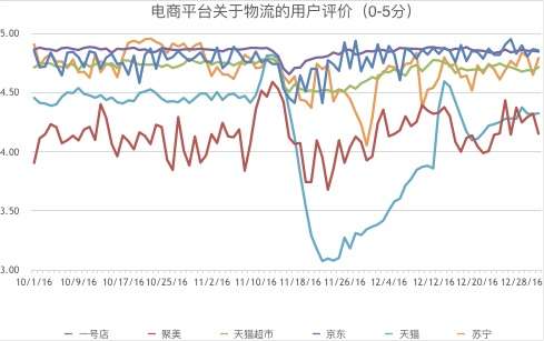 - 天猫的物流水平仍然较差,在双11之后断崖式跳水,甚至到年底都没有恢复之前的水平
