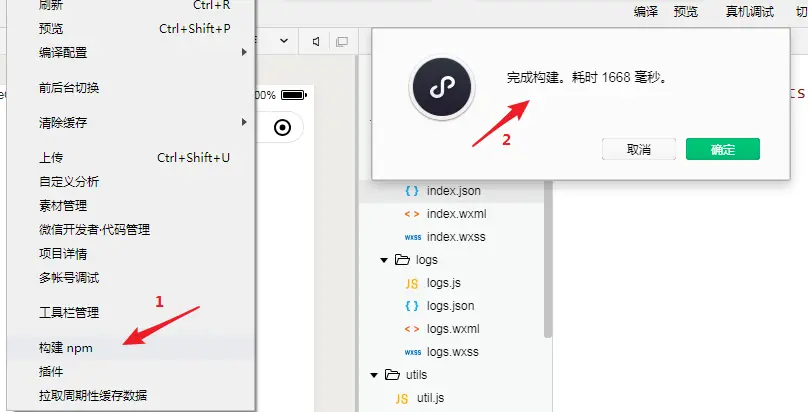 接着,在微信开发者工具中,选择 “工具” -》“构建 npm”: