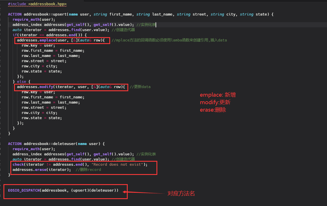 EOSIO_DISPATCH(addressbook, (upsert)(deleteuser))