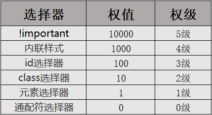 有了权值和权级的概念以后,我们就可以参考表格来对元素的权重进行理解。