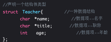 结构体Teacher就是一种数据结构,定义的name、age是数据项,Teacher 创建的 t1、t2... 是具体的数据元素,由多个t1、t2...构成的数组tArray[10] 即是数据对象