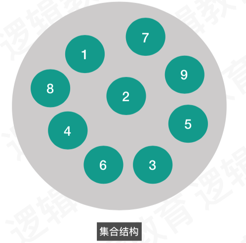 所有元素同属一个集合,没有先后顺序,也不存在其他关系
