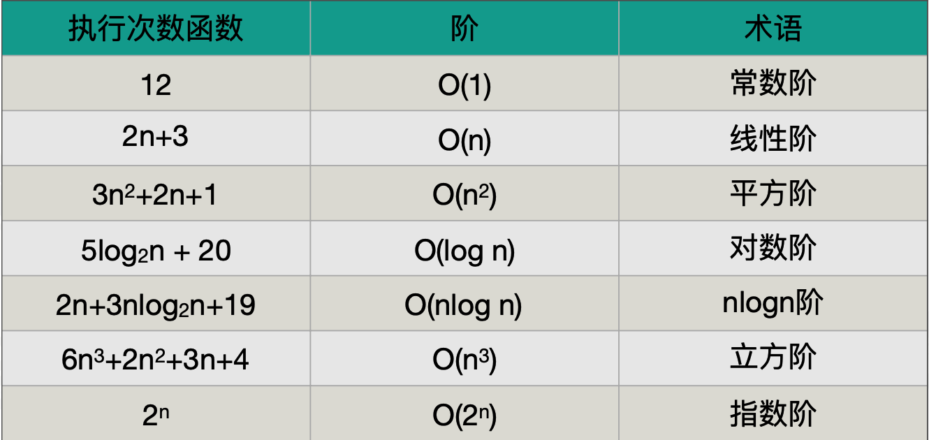 若存在函数 f(n),使得当n趋近于无穷大时,T(n)/ f(n)的极限值为不等于零的常数,则称 f(n)是T(n)的同数量级函数。记作 T(n)= O(f(n)),称O(f(n)) 为算法的渐进时间复杂度,简称时间复杂度。