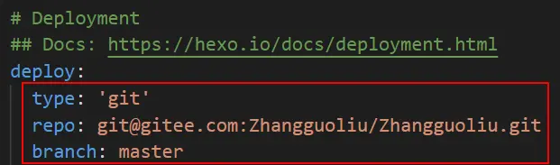 blog的目录下的_config.yml(区别于blog\themes\landscape下的_config.yml,前者称站点配置文件,后者称主题配置文件),其中repo后面的地址替换为自己的Gitee博客仓库地址。特别提示,冒号后面空一格: - “Hexo三连”: