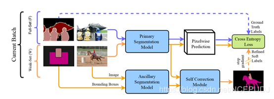 - 框架为自校正分割模型,因为它改进了弱监督标签的基础上,其当前的对象掩模概率模型。