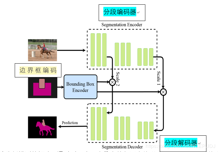 我们在设计辅助模型时的关键观察是,==基于编码器-解码器的分割网络通常依赖于从图像分类模型(例如,ImageNet预训练模型)初始化的编码器。这通常通过从大型图像分类数据集中转移知识来提高分割性能==。为了保持同样的优势,我们使用一个并行包围盒编码器网络来扩充基于编码器-解码器的分割模型,该网络以不同的比例嵌入包围盒信息(见图2)。