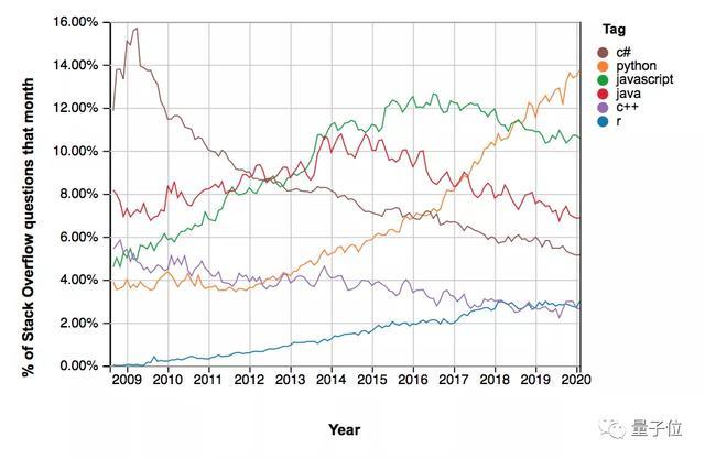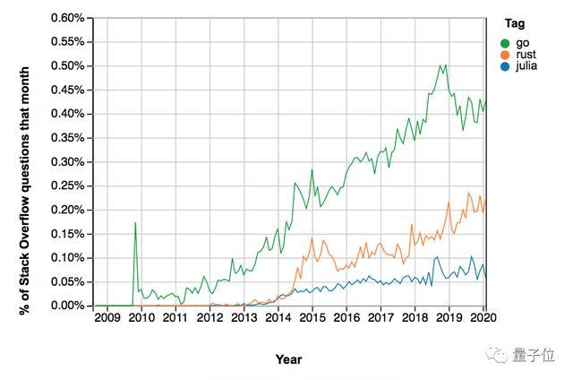 所有这些语言都擅长于未来的技术,尤其是人工智能。虽然它们的市场份额仍然很小,但从StackOverflow标签的数量可以看出,它们上升的趋势都很明显。