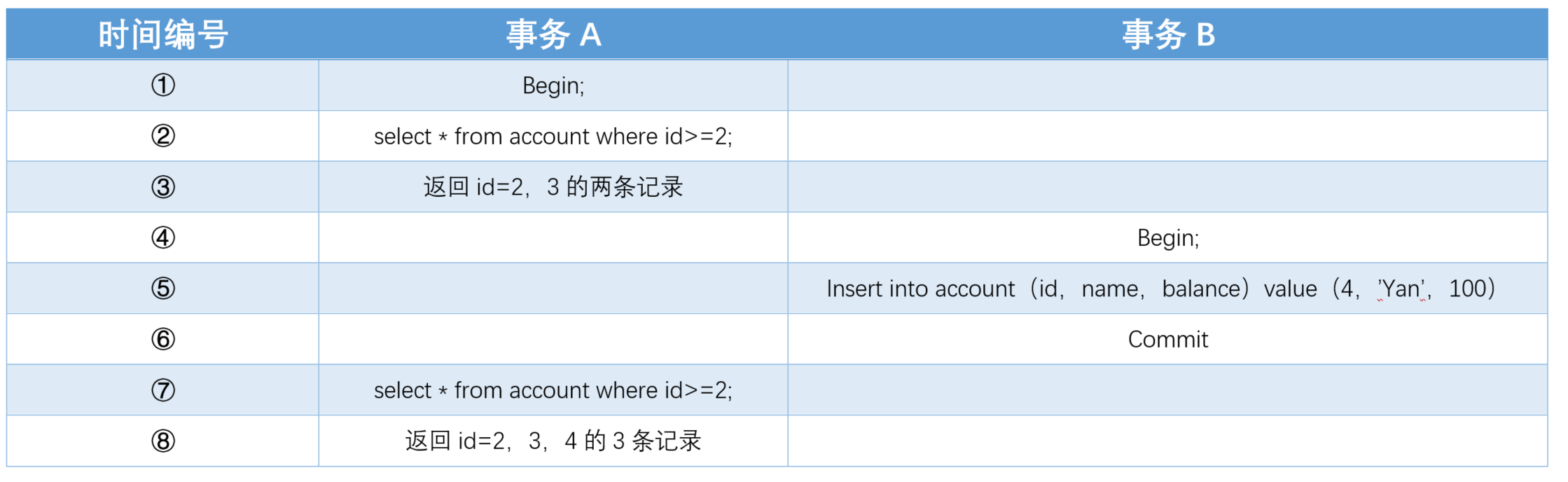 - 事务A先查询id大于2的账户记录,得到记录id=2和id=3的两条记录