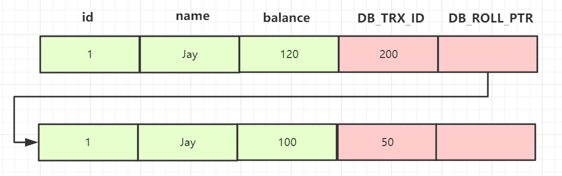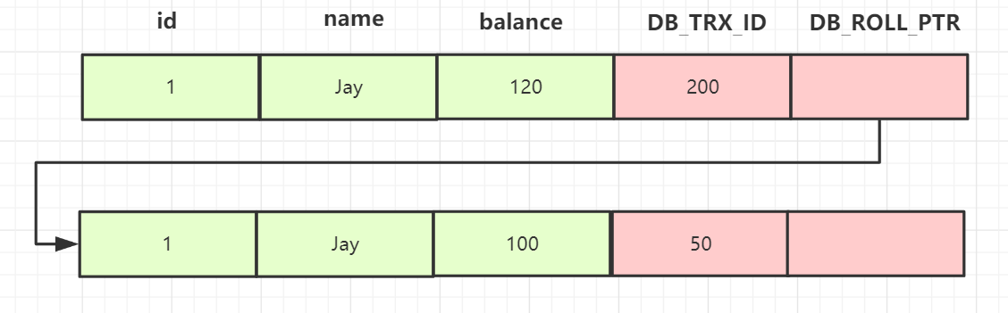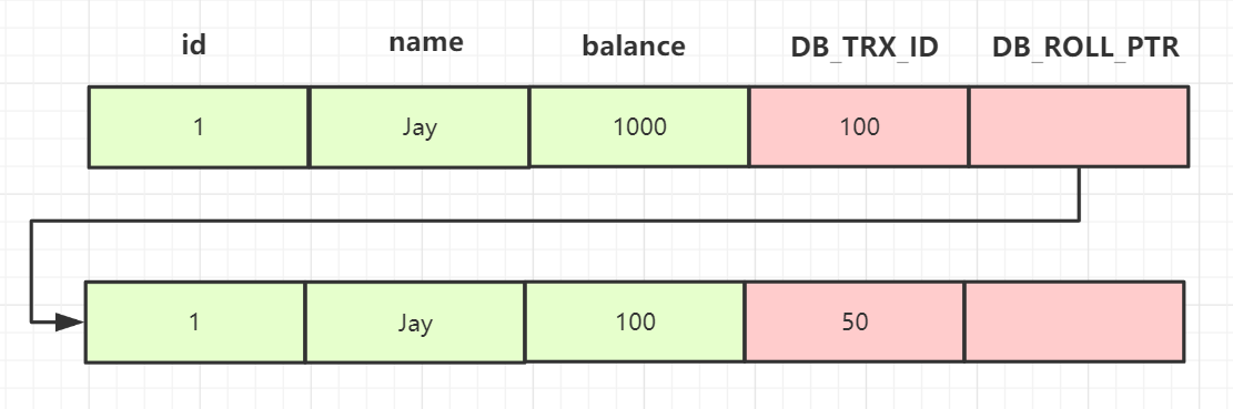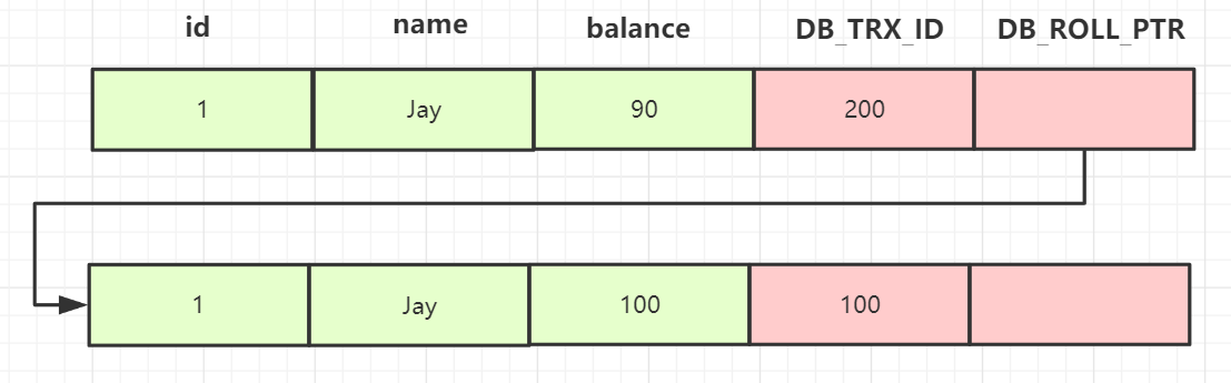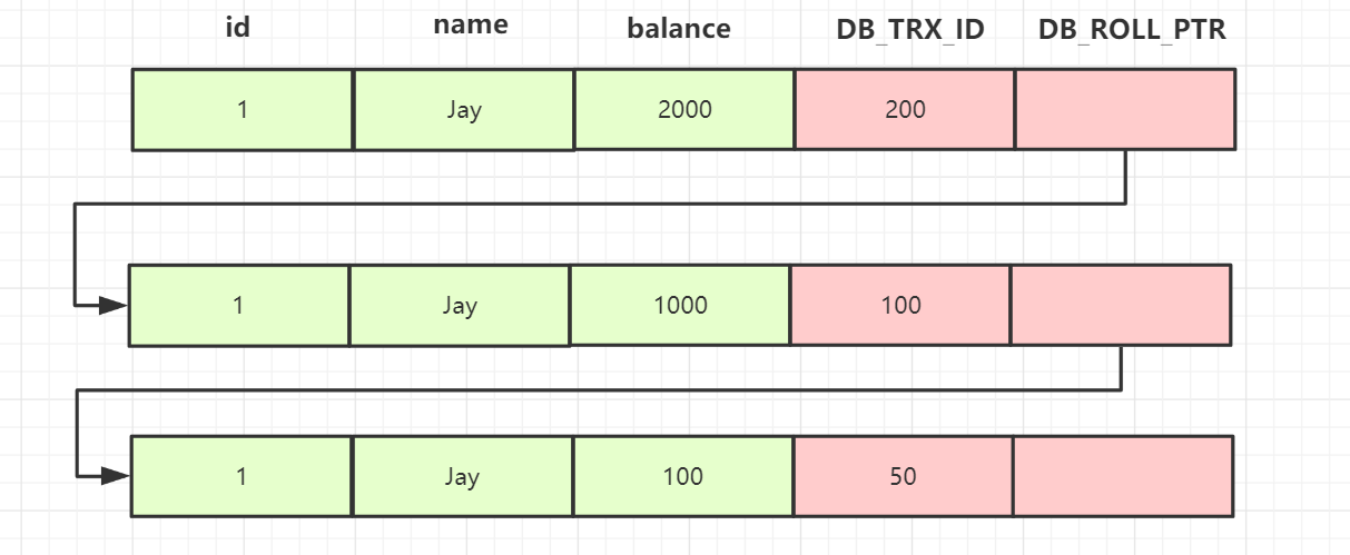 在事务B中,执行更新操作,把id=1的记录balance修改为2000,更新完后,undo 日志链如下: