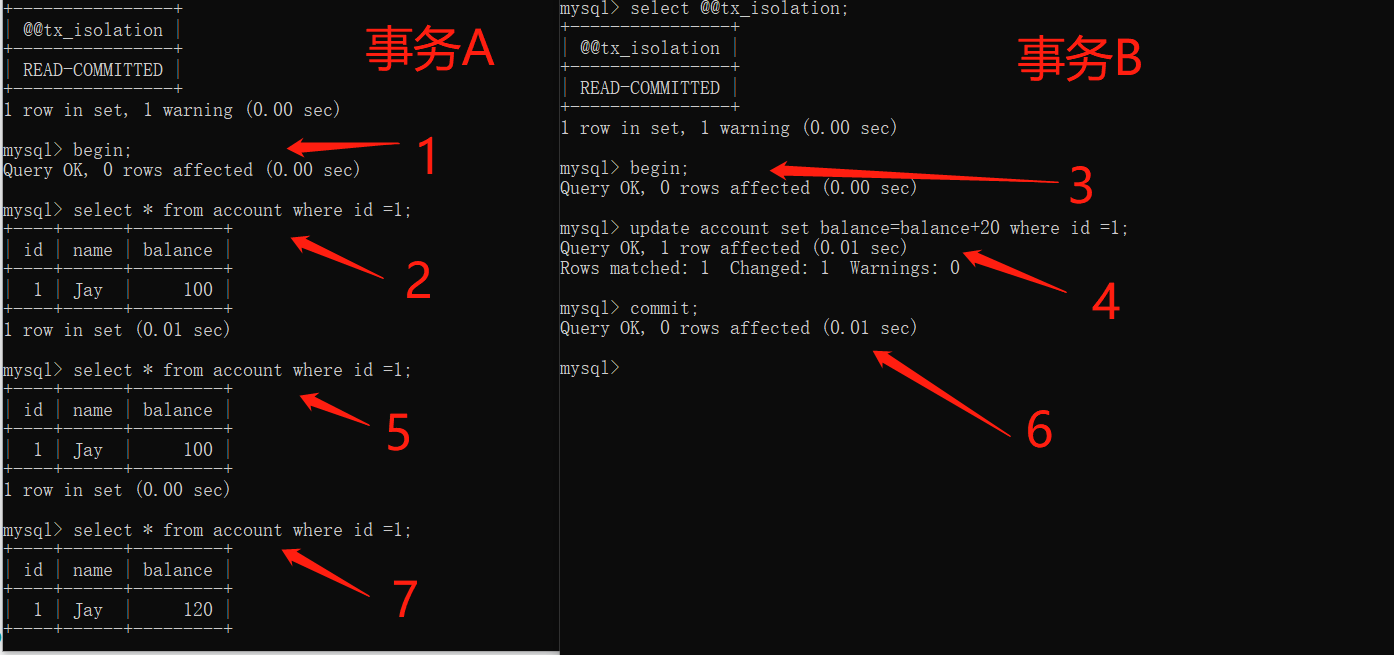 把当前事务隔离级别设置为已提交读(READ COMMITTED),开启事务A,查询account中id=1的数据