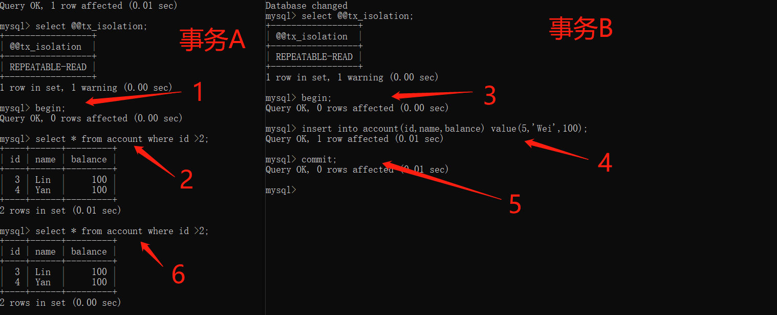 哈哈,步骤1、2、6的查询结果都是一样的,即repeatable read解决了不可重复读问题,是不是心里美滋滋的呢,终于解决老板的难题了~