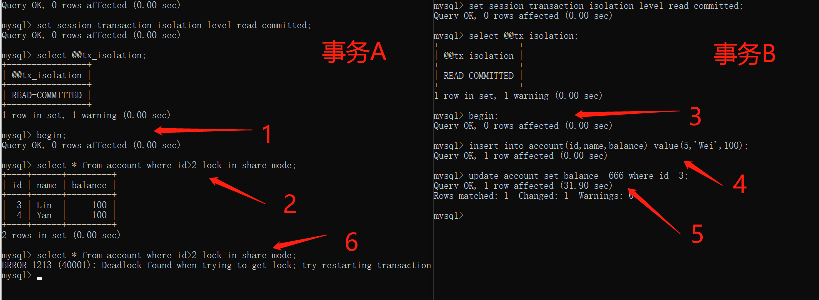 假设现在有两个事务A和B: