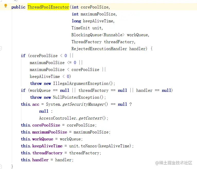 参数讲解(面试必问):corePoolSize 是cpu核心线程数(不会被销毁),当任务数比较大的时候 核心线程处理不完任务就会进入Blocking(阻塞队列),当阻塞队列依然不够存放的时候就会重新开启新的线程数,最多总线程达到maximumPoolSize,当达到最大线程数依然处理不完,就会交给RejectedExecutionHandler(拒绝策略)处理,keepAliveTime是线程空闲多长时间后会被销毁(核心线程不在这个范围内),TimeUnit是时间单位一般是秒,threadFactory一般没什么用,主要是给线程命名,可以不关注。