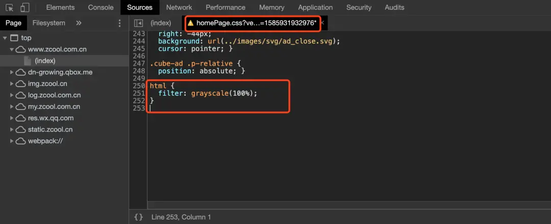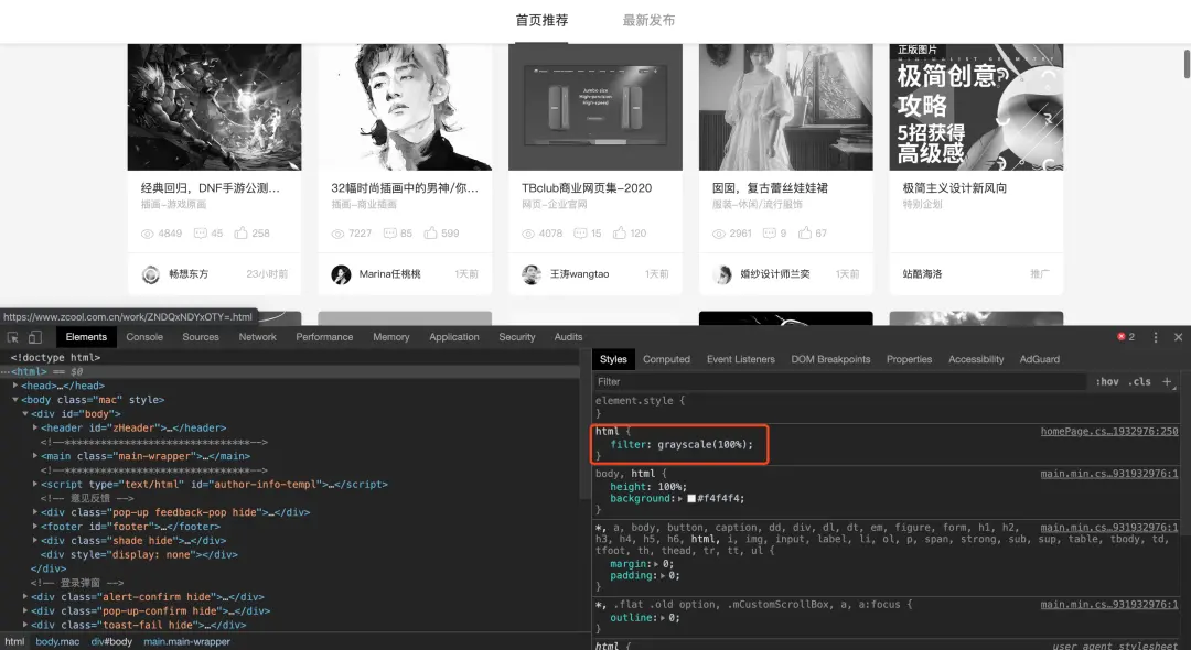 这里我们看到在 html 多了一行 fliter 样式 grayscale() ; 这个滤镜的效果就是 灰度;