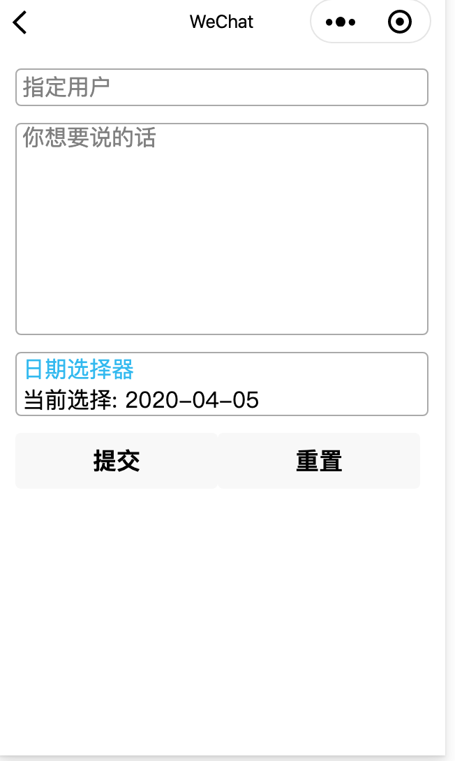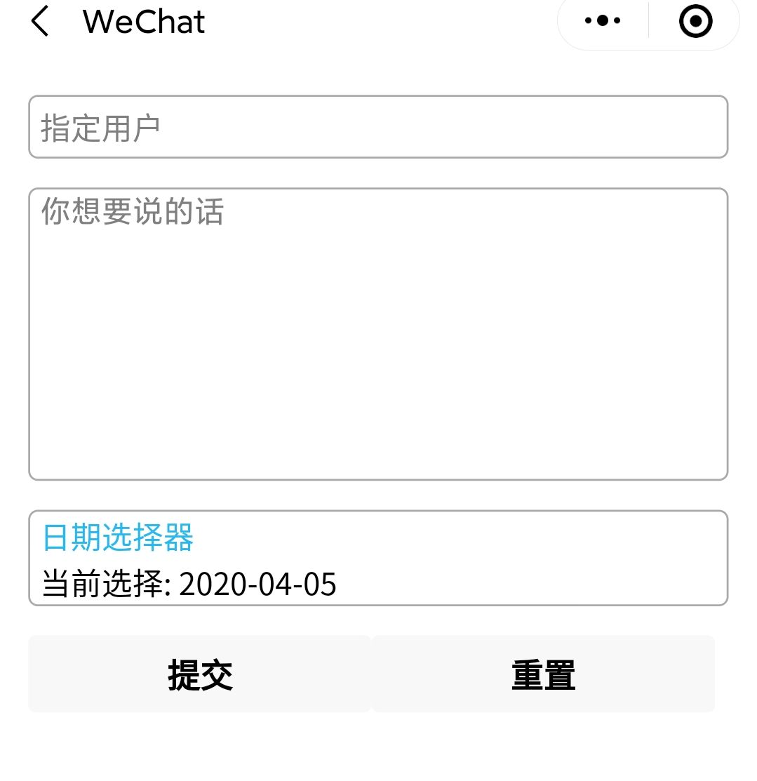 <view id="put-box"> <form bindsubmit="formSubmit" bindreset="formReset"> <!-- 时间胶囊指定接受用户 --> <input class="username" name="username" maxlength="11" placeholder="指定用户" /> <!-- 记录要告诉某人的话 --> <textarea class="text" placeholder="你想要说的话" name="textarea" /> <!-- 选择什么时候被打开 --> <view class="section"> <view class="section__title">日期选择器</view> <!-- 时间选择组件 --> <picker name="date" mode="date" value="{{date}}" start="{{date}}" bindchange="bindDateChange"> <view class="picker">当前选择: {{date}}</view> </picker> </view> <view class="btn-area"> <button formType="submit">提交</button> <!-- 将所有选项初始化 --> <button formType="reset">重置</button> </view> </form></view>当填好信息提交后,地图就会收到markers中被添加进了新的胶囊