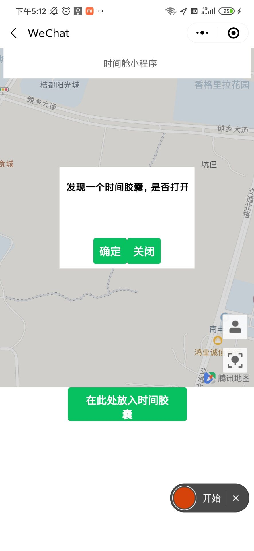 // 能否开启时间胶囊 openCapsule: function (res) { const markers = this.data.markers const that = this markers.map(item => { if (that.hasCapsule(res, item) && item.username == that.data.username && item.date == that.data.date) { that.setData({ isOpen: '', CapsuleId: item.id, toast: '发现一个时间胶囊,是否打开?' }) // 如果检测到附近有,就关闭实时定位监控 wx.stopLocationUpdate() } }) }hasCapsule 判断附近是否存在胶囊