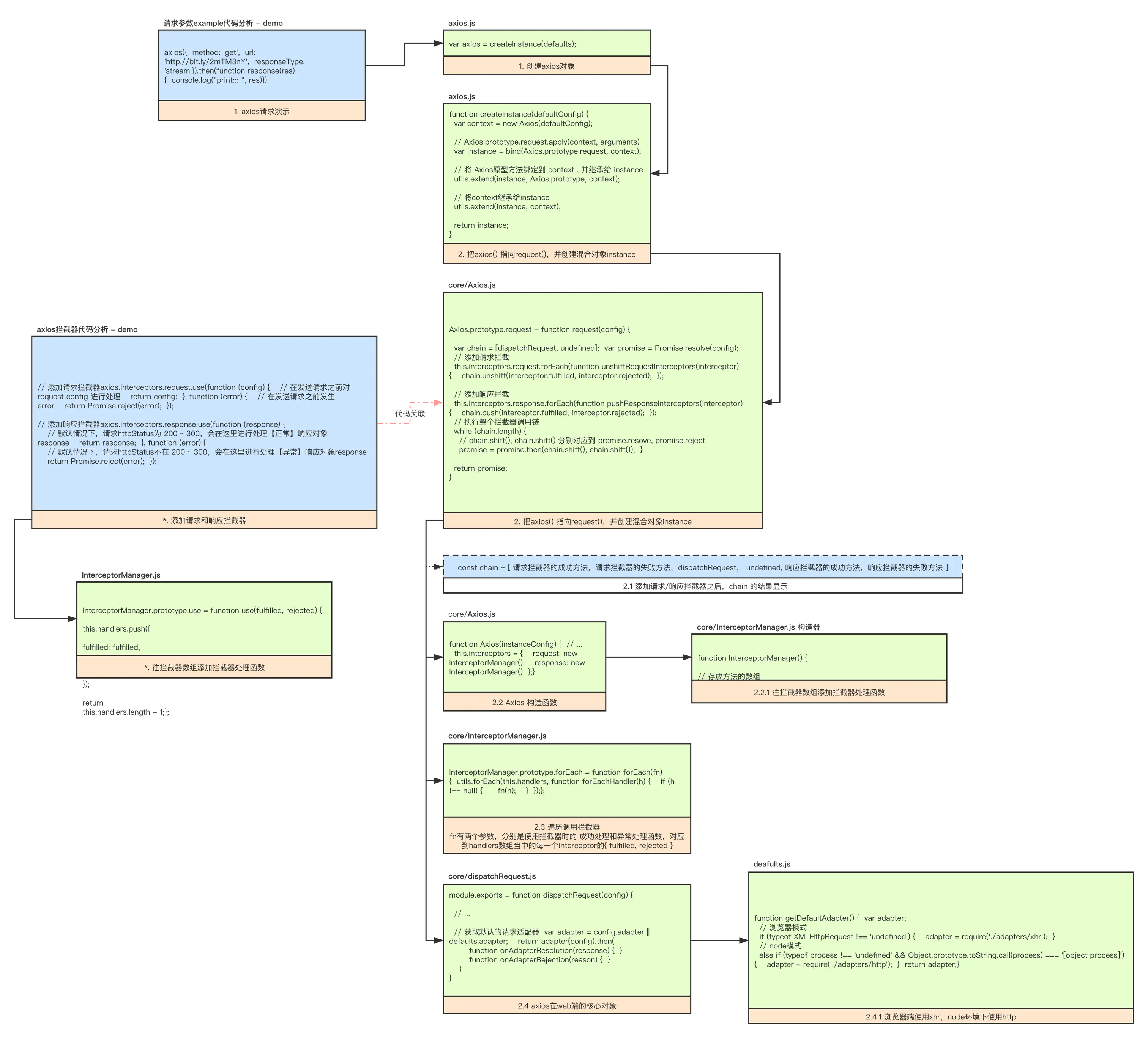 ③ 通过上面分析axios混合对象之后会发现,axios(config)本质上是在调用Axios.prototype.request方法,并在这个方法内完成每次请求时的Promise请求调用链chain生成。【如图中第2步】