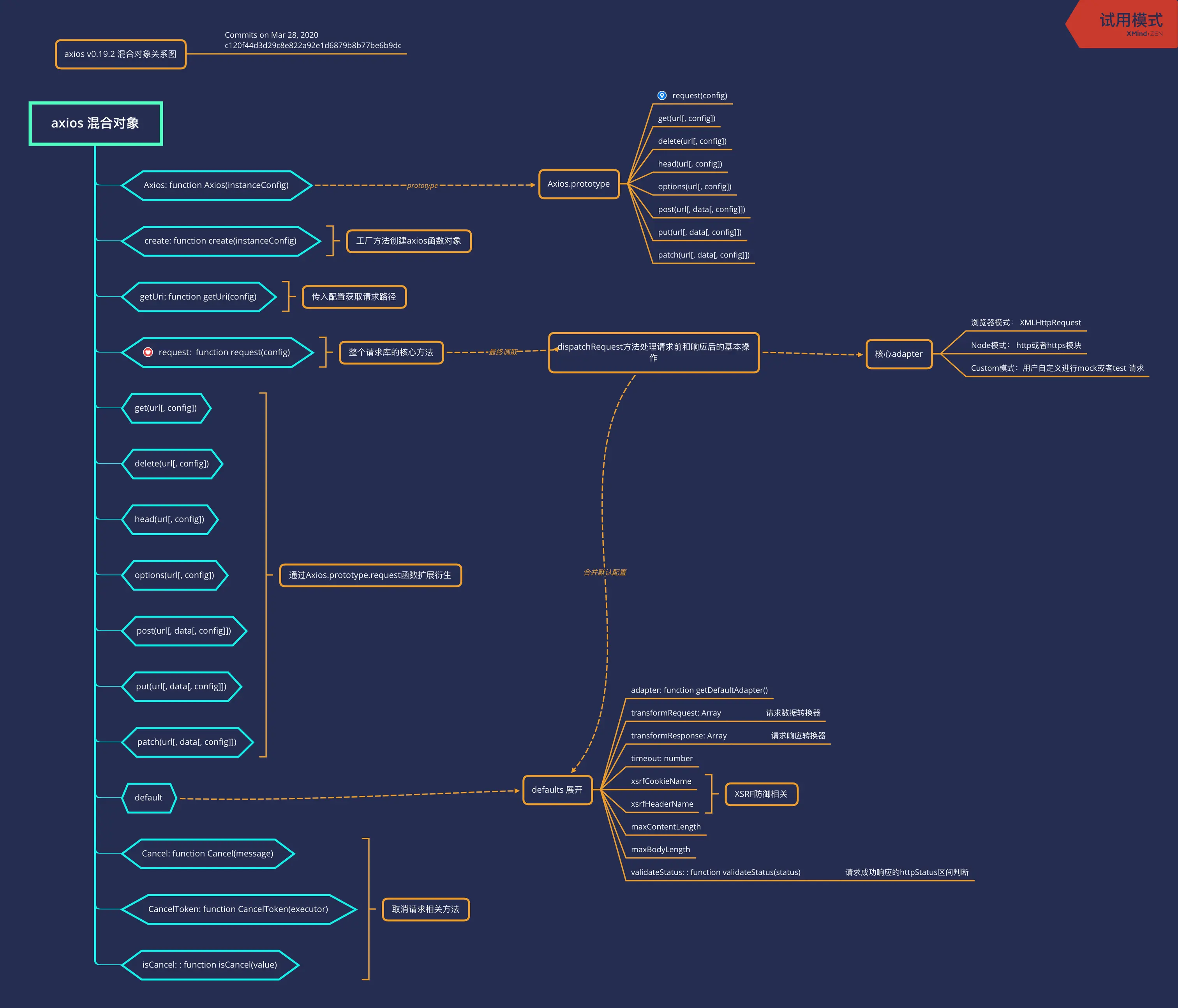 上述三步操作完美的实现了axios既能当成**axios({config})函数调用,也可以当成对象axios[method](url[, config])**调用,基于上述三步之后,我绘制了axios的混合对象关系图