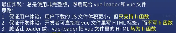 当使用 vue-loader 或 vueify 的时候,*.vue 文件内部的模板会在构建时预编译成 JavaScript。你在最终打好的包里实际上是不需要编译器的,所以只用运行时版本即可。
