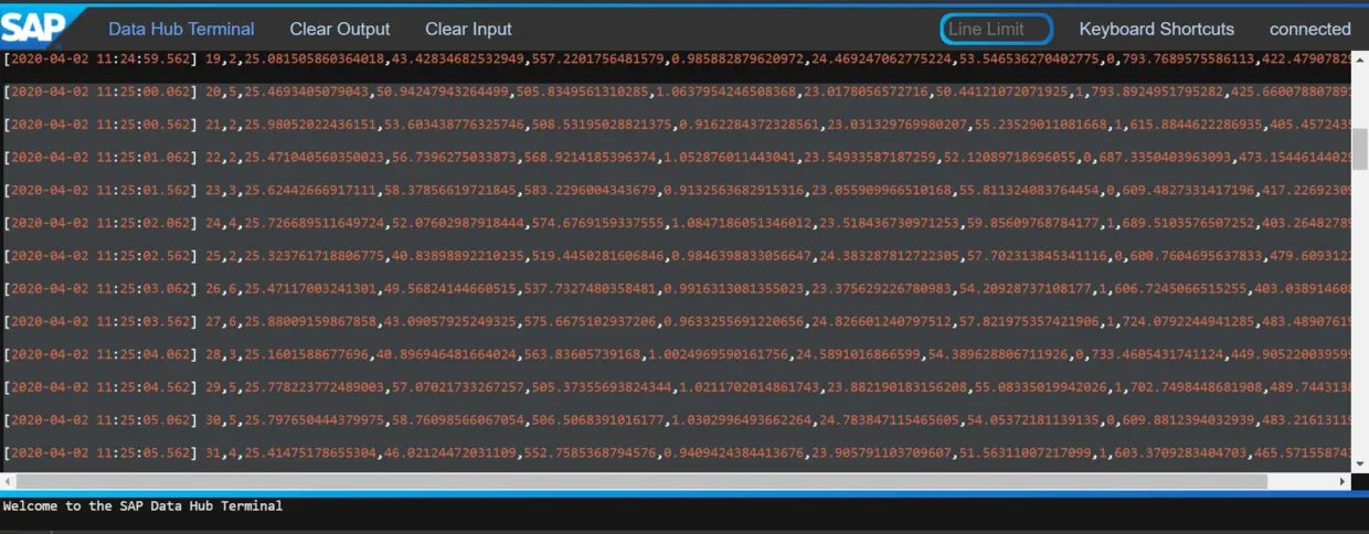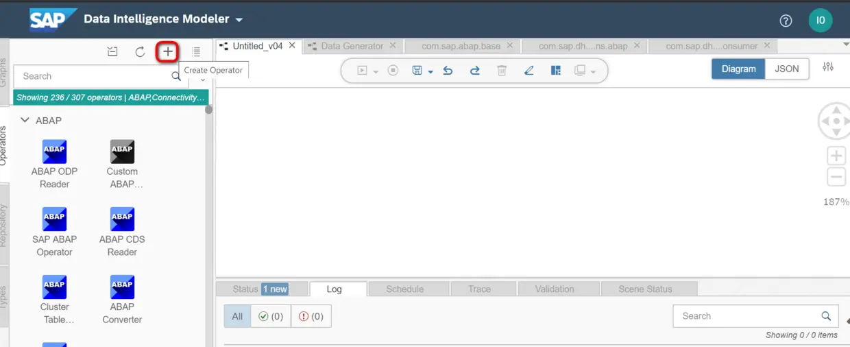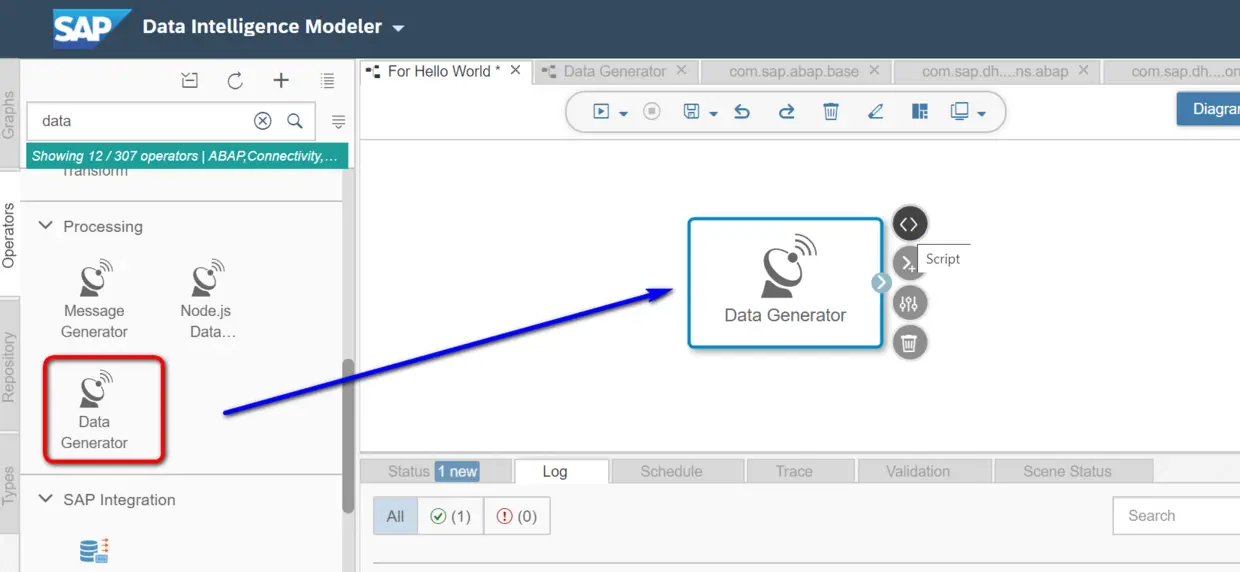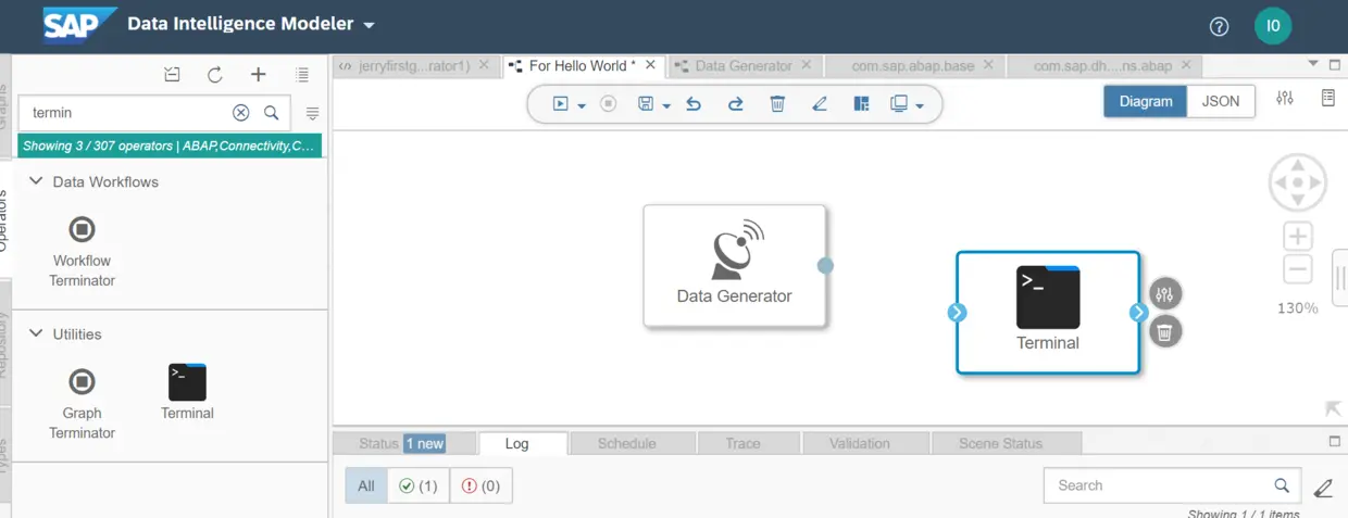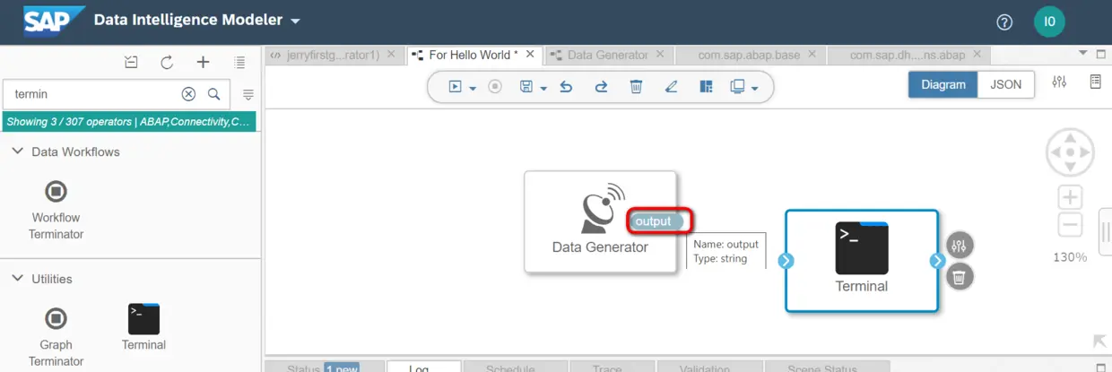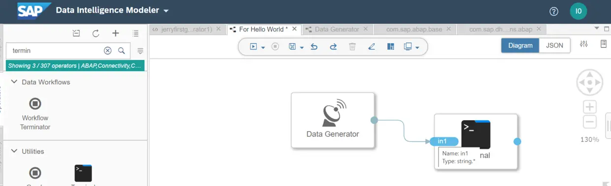 在SAP Data Intelligence Modeler里创建新的pipeline 已注销 2020-04-05 189 阅读1分钟 新建一个graph: 保存: 将Processing下面的Data Generator这个Operator拖拽到graph的编辑区域,点击<>符号开始编辑脚本: 可以查看自动生成的JavaScript代码: 这个Generator生成的随机数需要一个输出,这里我们选择terminal operator: 将data Generator的outport绑定到terminal的inport: 执行: 在终端上看到打印的输出: 要获取更多Jerry的原创文章,请关注公众号"汪子熙":
