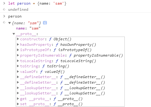 __proto__属性中还有一个__proto__,而第二个__proto__属性和原型一部分中的是一样的。所以有这样的等式person.__proto__ === a.__proto__.__proto__。此外,二者也都还相等于Object.prototype。