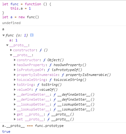 __proto__属性指向其构造函数的prototype属性,也因此,截图中的a.__proto__ === func.prototype。而对象的__proto__属性一般是直接指向Object的原型对象,即a.__proto__ === Object.prototype。