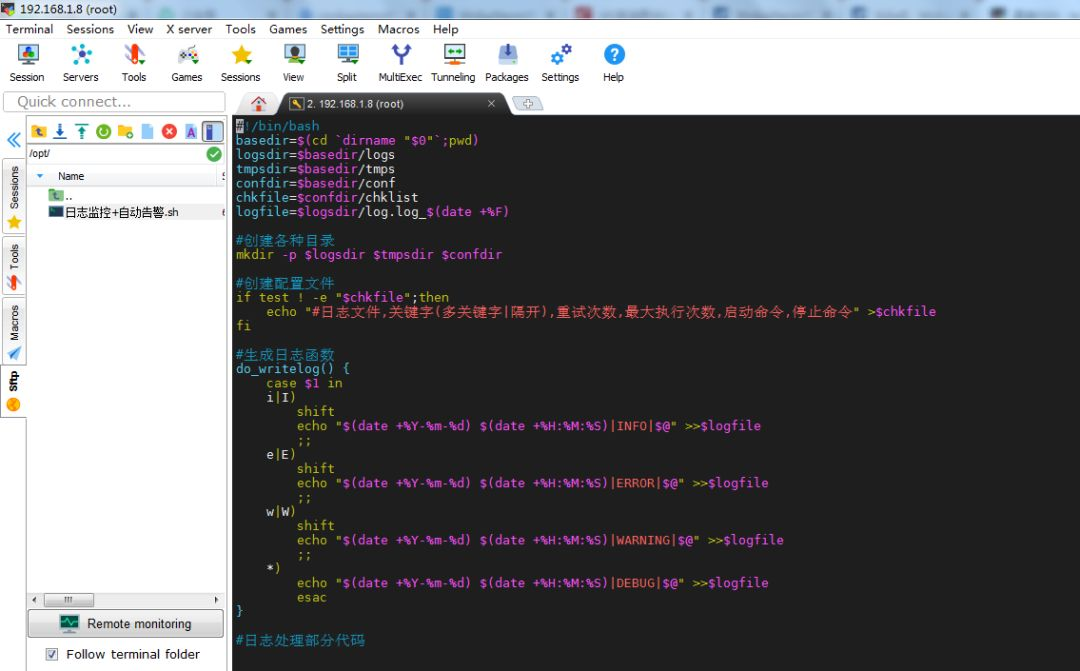 [root@mysql-1 ~]# cd /opt[root@mysql-1 opt]# lltotal 8-rw-r--r-- 1 root root 6521 Mar 19 13:44 日志监控+自动告警.sh[root@mysql-1 opt]#的确有这个文件,上传非常方便。