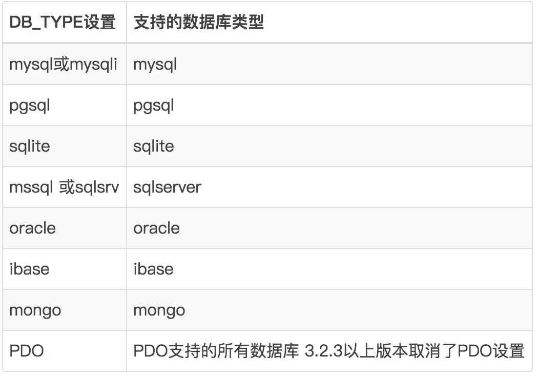 //数据库配置信息 'DB_TYPE' => 'mysql', // 数据库类型 'DB_HOST' => 'localhost', // 服务器地址 'DB_NAME' => 'thinkphp', // 数据库名 'DB_USER' => 'root', // 用户名 'DB_PWD' => '123456', // 密码 'DB_PORT' => 3306, // 端口 'DB_PREFIX' => 'think_', // 数据库表前缀 'DB_CHARSET'=> 'utf8', // 字符集 'DB_DEBUG' => TRUE, // 数据库调试模式 开启后可以记录SQL日志 3.2.3新增