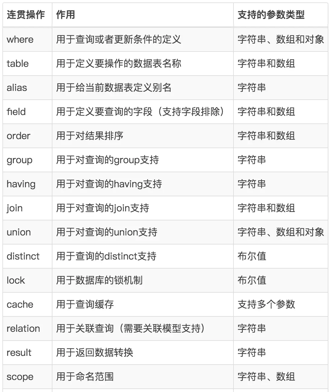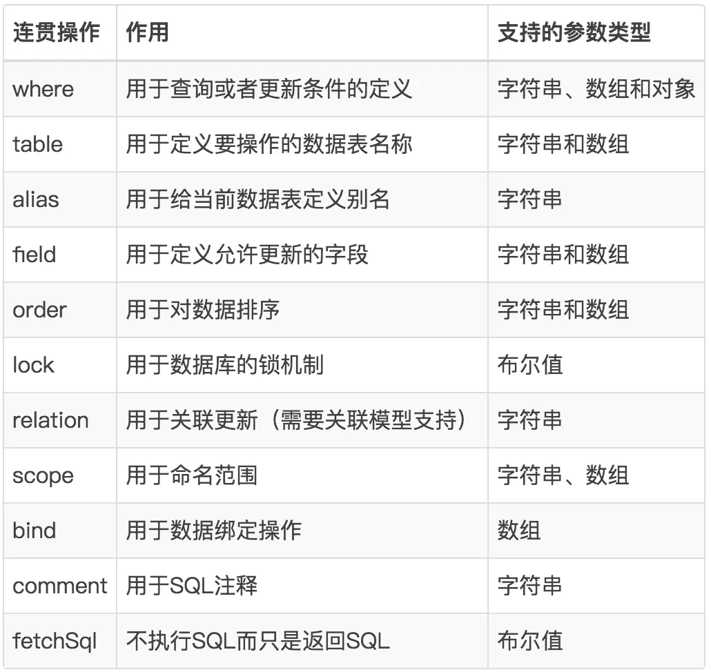 - ThinkPHP提供了灵活和方便的数据操作方法,对数据库操作的四个基本操作(CURD):创建、更新、读取和删除的实现是最基本的,也是必须掌握的,在这基础之上才能熟悉更多实用的数据操作方法。CURD操作通常是可以和连贯操作配合完成的。