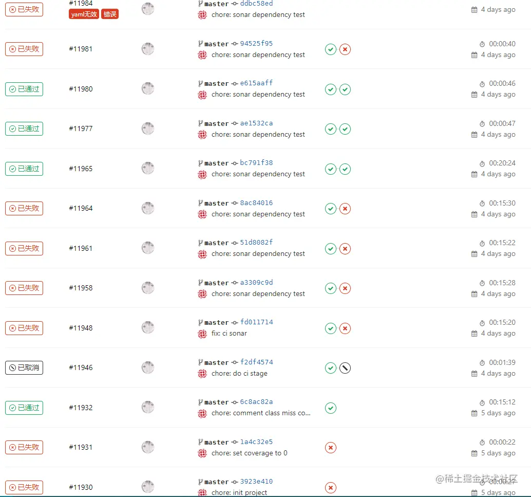But... 跑了好多次流水线都是 Failed(瞧,一天就过去了),特别是一开始没有将 Sonar 相关的 Maven 依赖挂载出来,跑一次流水线需要 20 分钟,调试效率可想而知(虽然 Runner 配置了 Maven 依赖的挂载,因为 Sonar 还有自己的缓存数据需要挂载,就是下面的路径(暂且这么认为),挂载后直接将达几十秒,跑流水线一定要把 Maven 依赖挂载出来,不然每次 PR 真的欲仙欲死)