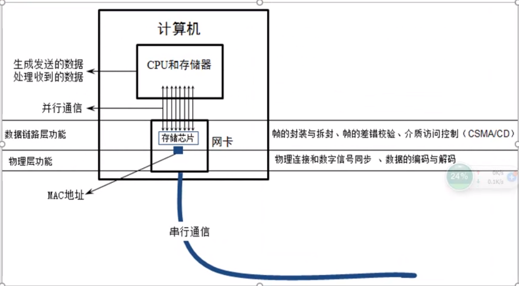 - cpu将数据通过总线并行通讯发送给网卡软件