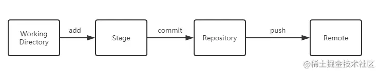 通过命令git init初始化仓库后,git add将文件添加到暂存区,git commit将暂存区文件提交到本地仓库,push将本地仓库推送到远程仓库