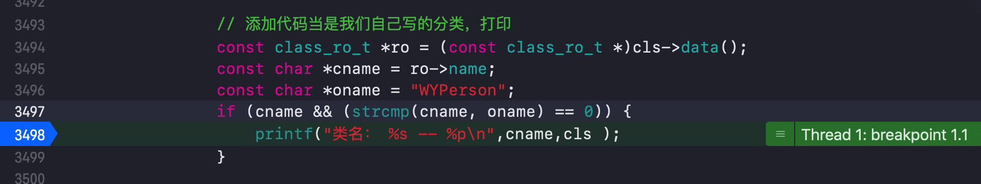 printf("类名: %s -- %p\n",cname,cls );