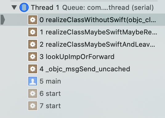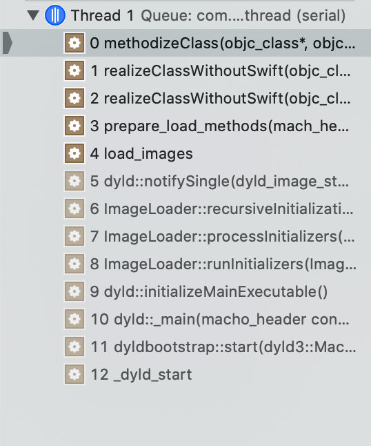 我们知道无论是懒加载类还是非懒加载类都会在realizeClassWithoutSwift(objc779.1)中进行加载,我们在此方法中加上打印的代码,并在if中执行部分打上断点,查看调用堆栈。