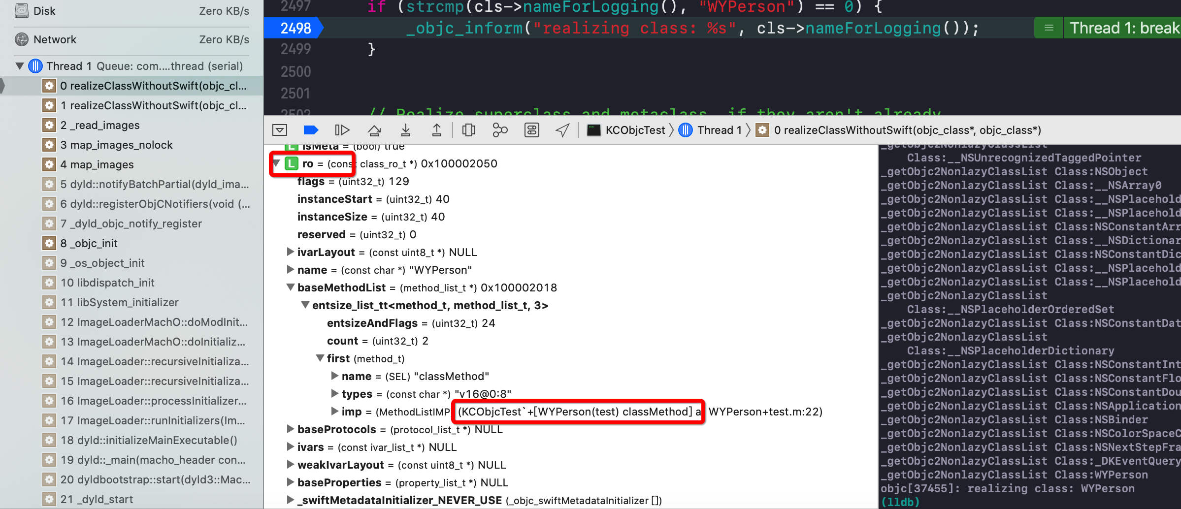 imp = 0x0000000100000ea0 (KCObjcTest`+[WYPerson(test) classMethod] at WYPerson+test.m:16)