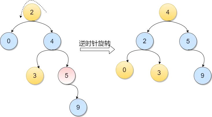 如下图,因为在A的右孩子的右孩子插入新的节点,导致A的平衡因子从-1变为-2,不在满足根本性质[-1,1],所以需要通过旋转。显然,按照大小关系,结点元素7应作为新的根结点,其余两个节点分别作为左右孩子节点才能平衡,这样看来,仿佛节点元素5绕结点元素7逆时针旋转一样。