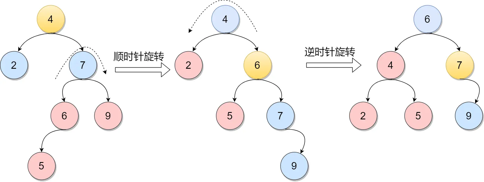 由于节点元素6增加一个左孩子,导致元素4变得不平衡。先顺时针旋转元素7再逆时针旋转4元素达到平衡。