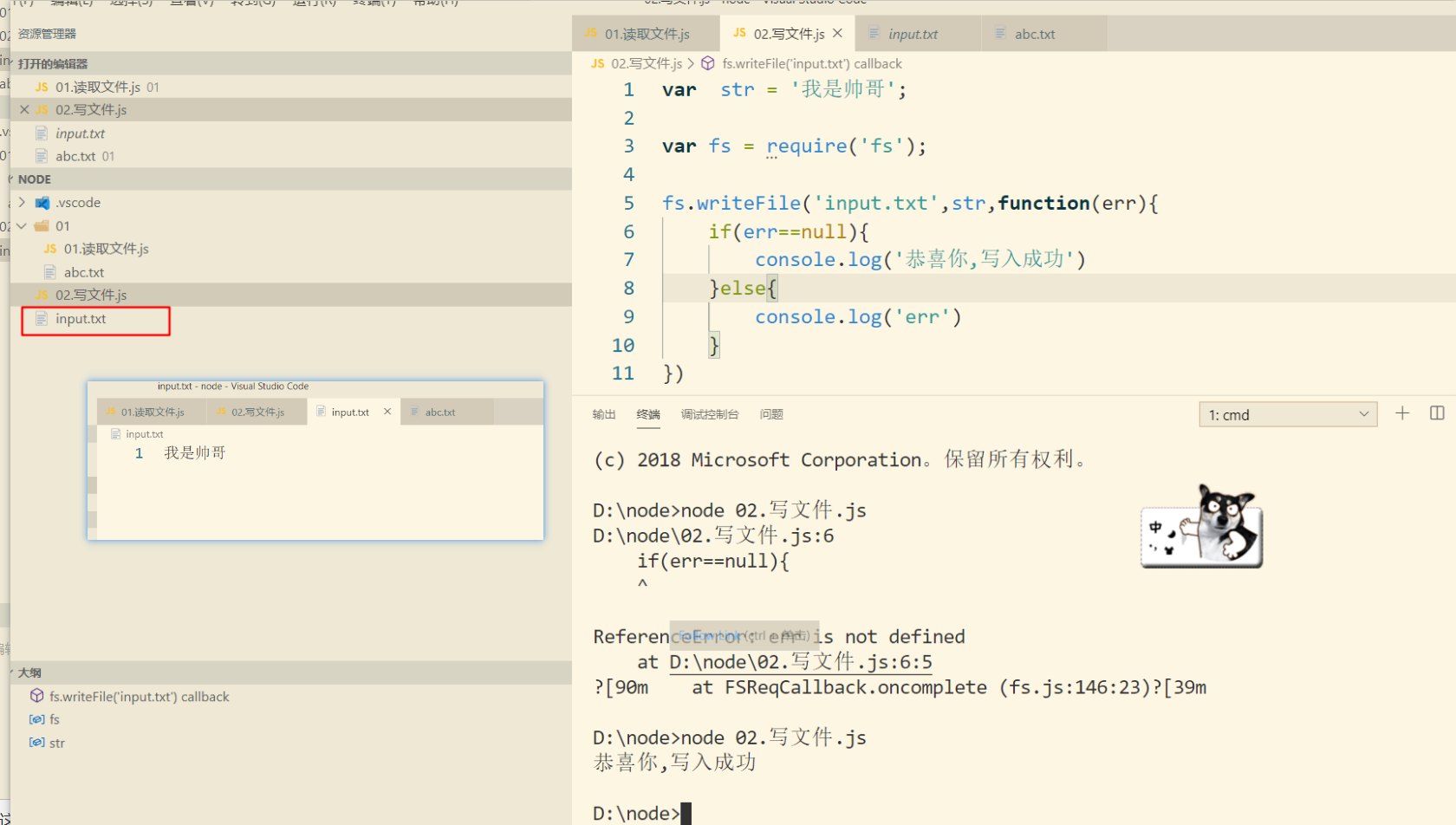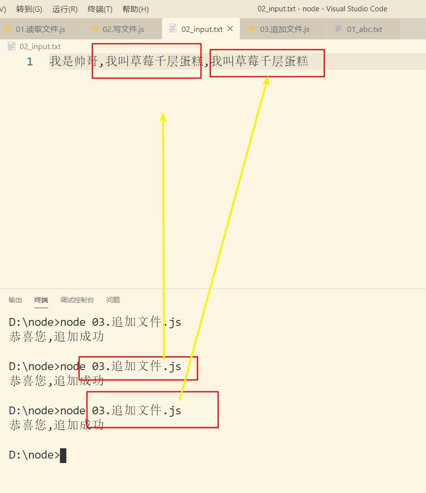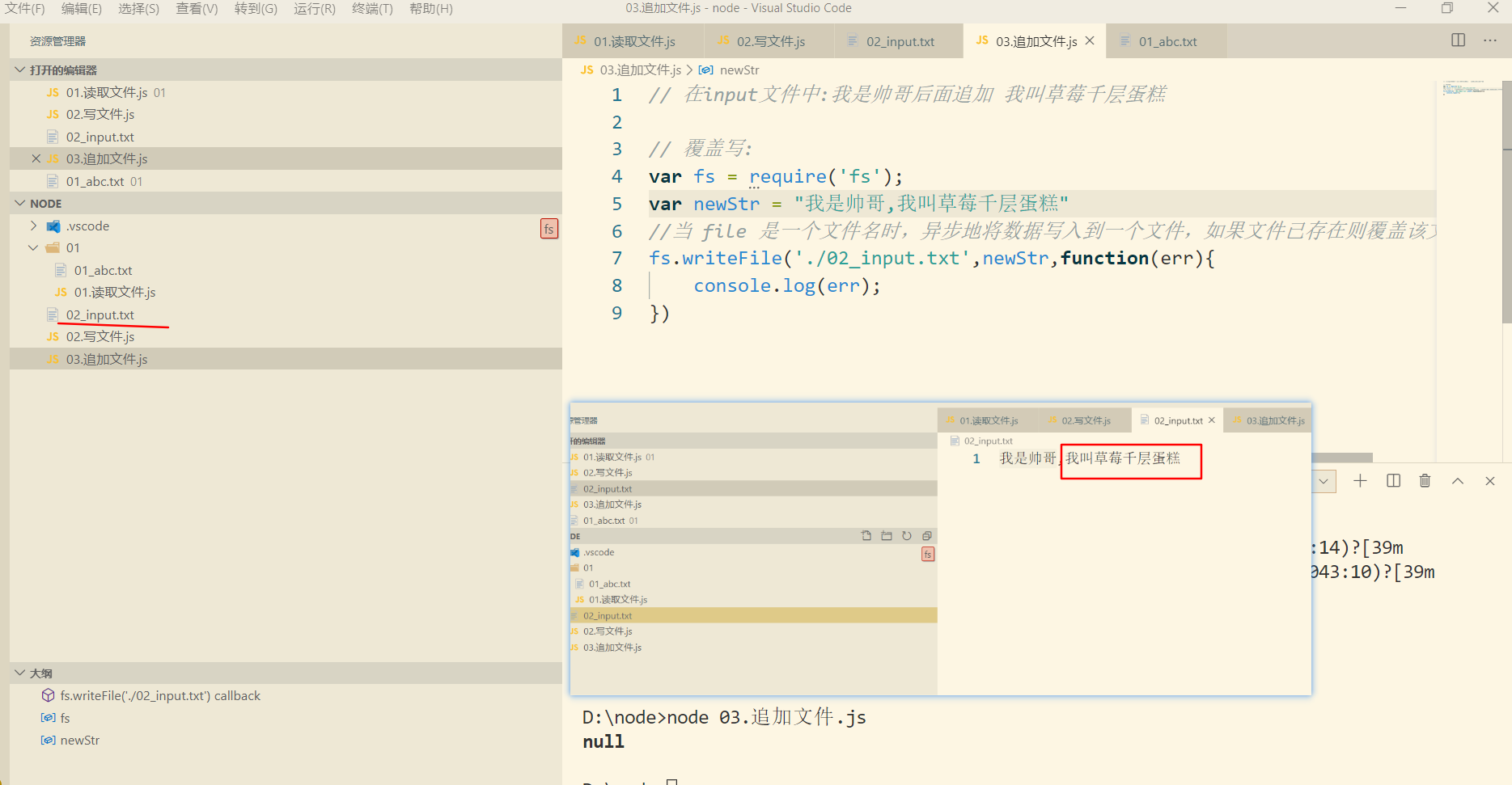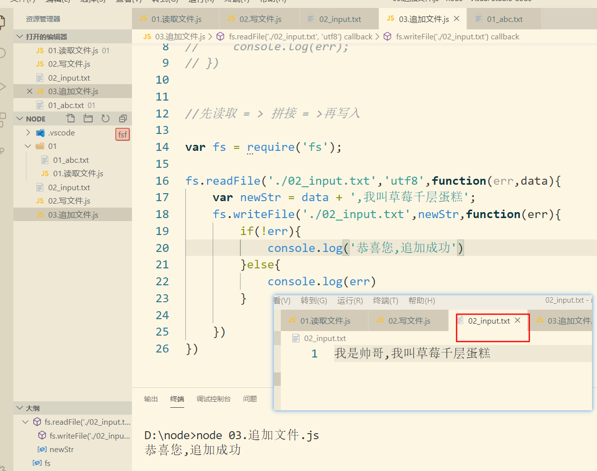 //先读取 = > 拼接 = >再写入 var fs = require('fs'); fs.readFile('./02_input.txt','utf8',function(err,data){ if(!err){ var newStr = data + ',我叫草莓千层蛋糕'; fs.writeFile('./02_input.txt',newStr,function(err){ if(!err){ console.log('恭喜您,追加成功') }else{ console.log('写入的err') } }) }else{ console.log('读取的err') } })json