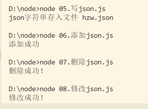 // 要求1:将数据转为字符串存入文件 hzw.json var str = [ {id:1,names:'路飞',sex:'男',img:''}, {id:2,names:'乌索普',sex:'男',img:''}, {id:3,names:'娜美',sex:'女',img:''} ] var json_Str = JSON.stringify(str); // console.log(json_Str); var fs = require('fs'); fs.writeFile('./hzw.json',json_Str,function(err){ if(!err){ console.log('json字符串存入文件 hzw.json') }else{ console.log(err); } })06.添加json.js