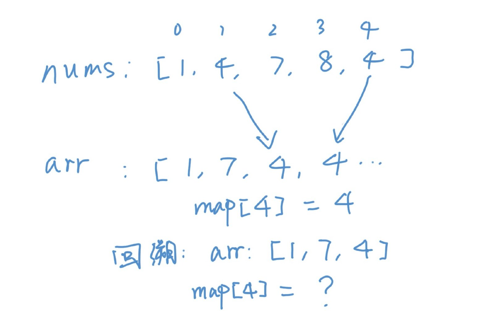 上面这个方法其实有点复杂,理解起来有很多细节,一个比较蛋疼的点就是我们用了map去记录了位置,由于要更新map,所以还需要记录之前的值,还需要判断元素不在map当中的情况。并且map的查找存在开销,那么我们能不能不用map呢?