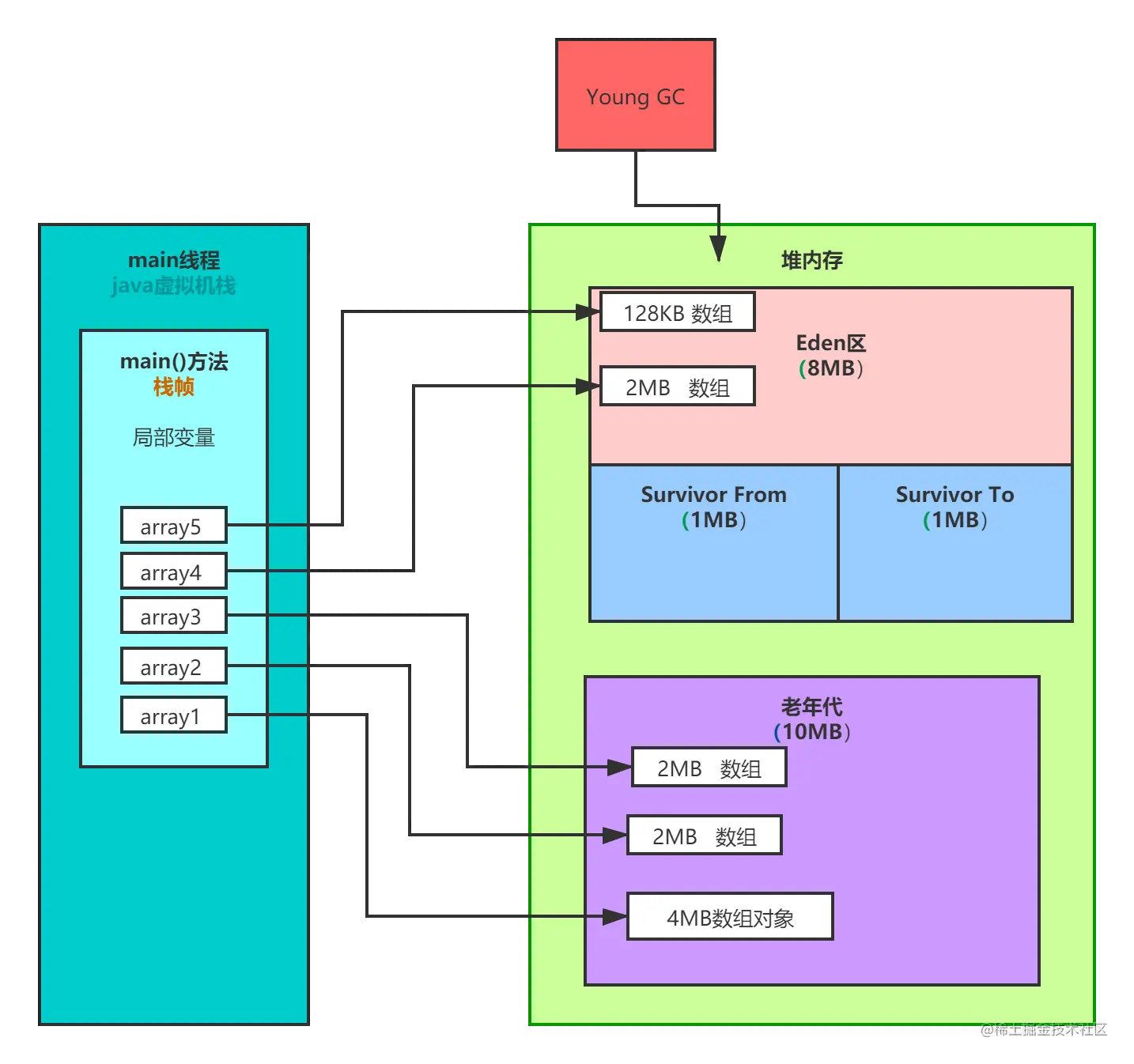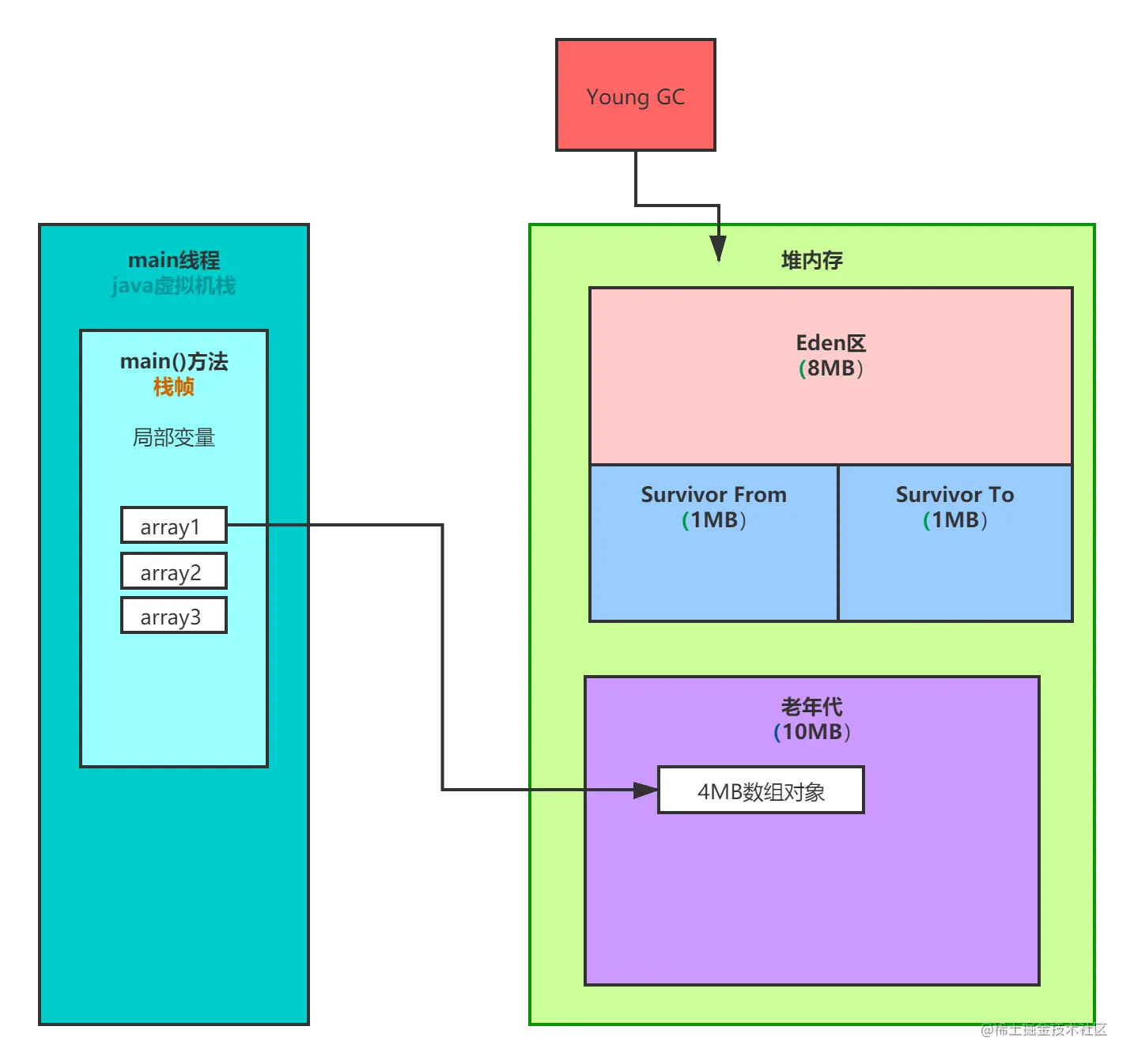 很简单,一定是在Young GC之后,先把2个2MB的数组放入了老年代,如下图。