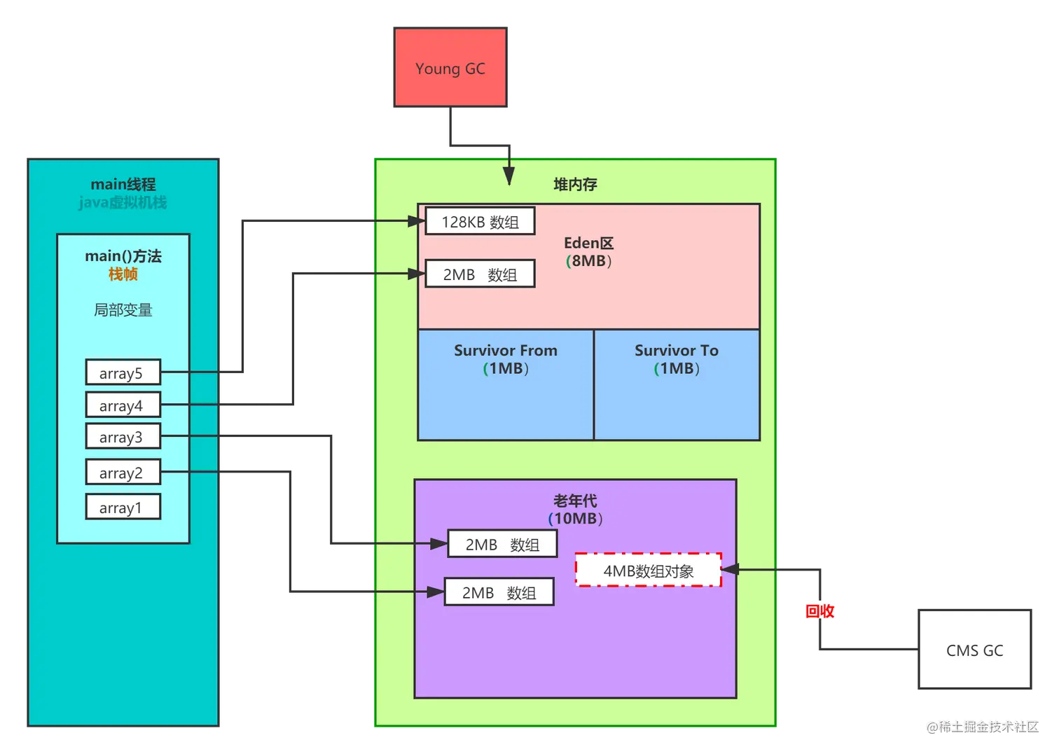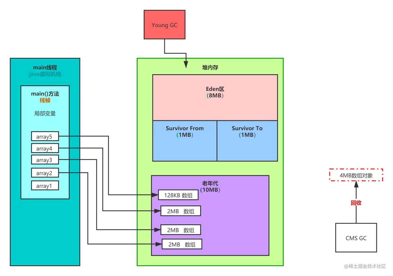 然后此时就会回收掉其中的一个4MB的数组,因为他已经没人引用了,如下图所示。