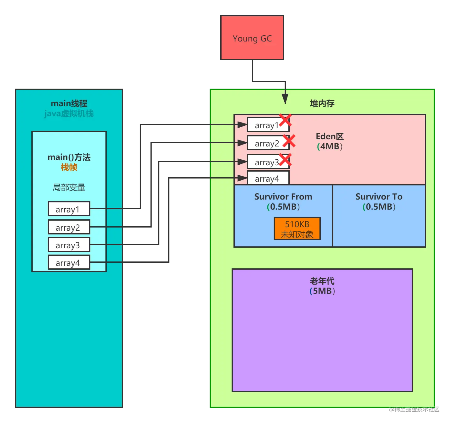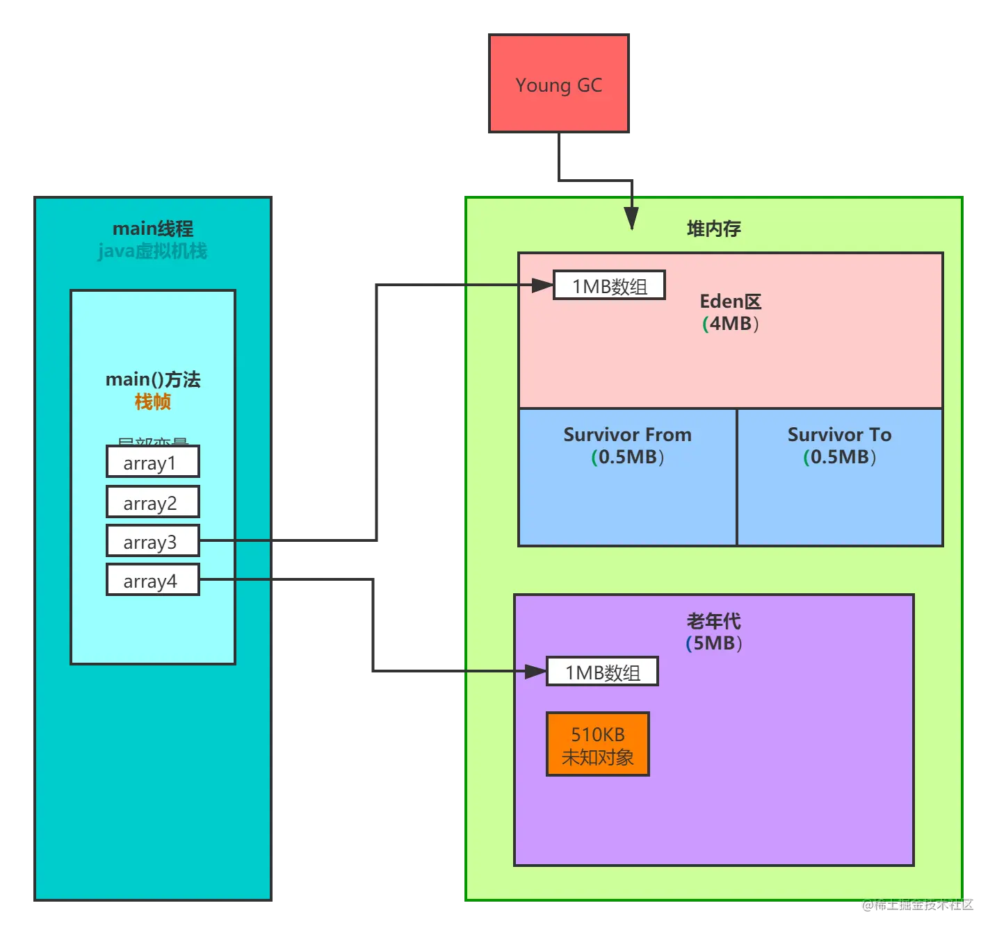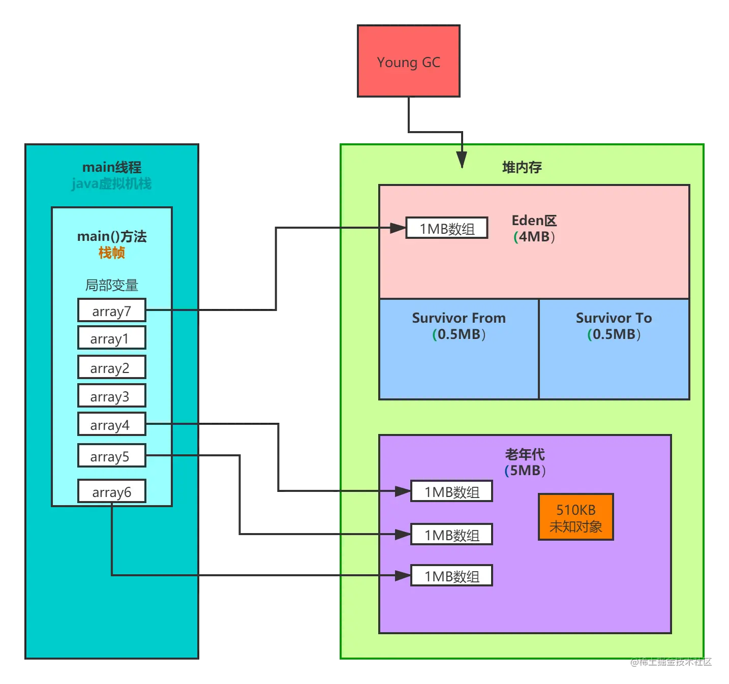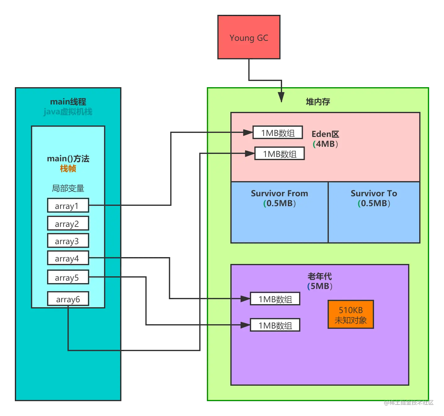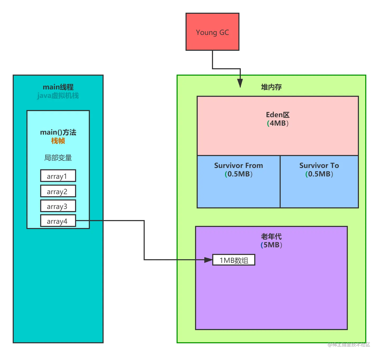 这1MB的数组首先肯定是准备进入Survivor From区,可是,在我们设置的JVM参数下,只有0.5MB,明显是不够分配的。根据JVM YoungGC的规则,Survivor区放不下GC之后存活的对象,直接进入老年代。