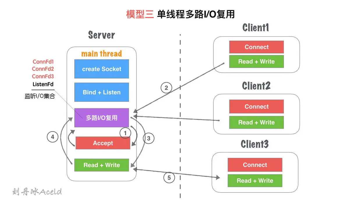 ③ 对于Client1的读写业务,Server依然在main thread执行流程提继续执行,此时如果有新的客户端Connect链接请求过来,Server将没有即时响应。
